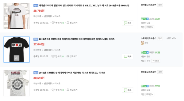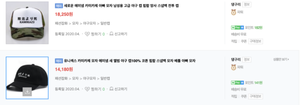 검색에 따르면 롯데온은 전범기로 국내에서 논란이 되는 욱일기가 훤히 그려진 가미카제 스포츠카방을, 네이버에서는 가미카제가 프린트된 티셔츠와 모자, 헤드밴드 등이 팔리고 있다. 쿠팡에서는 일장기 머리띠가 오픈마켓의 구매대행 상품으로 노출됐다가 판매를 중단하기도 했다.