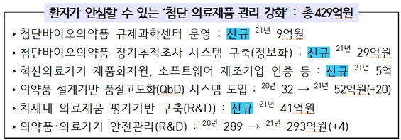 이에 투자되는 예산안 총 총429억 원은 △첨단바이오의약품 규제과학센터 운영에 9억 원 △첨단바이오의약품 장기추적조사 시스템 구축(정보화)에 29억 원, 혁신의료기기 제품화 지원, 소프트웨어 제조기업 인증 등에 5억 원 △의약품 설계기반 품질고도화(QbD) 시스템 도입에는 20억 원 증액된 52억 원 △차세대 의료제품 평가기반 구축(R&D)에 41억 원 △의약품·의료기기 안전관리(R&D)에도 4억 원 증액 된 293억 원이 투자된다.