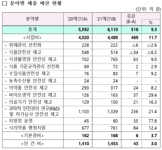 식약처는 내년 예산에 코로나19 치료제·백신 등 방역물품 개발·공급 및 안전관리 예산을 최우선으로 반영했다고 설명했다. 또 어린이 급식 식중독 예방, 해외직구 식품 검사 등 △먹을거리 안전 확보와 △첨단 의료제품 관리 강화 △미래대비 안전기반 구축에 중점을 두고 예산을 편성했다.