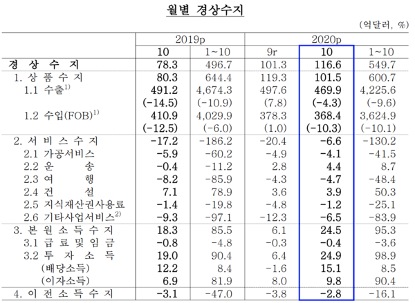 한국은행이 4일 발표한 10월 국제수지(잠정) 통계에 따르면, 10월 경상수지는 116억6000만 달러로 집계됐다. 이는 101억3000만 달러를 기록한 9월 대비 15억3000만 달러 증가한 수치다.