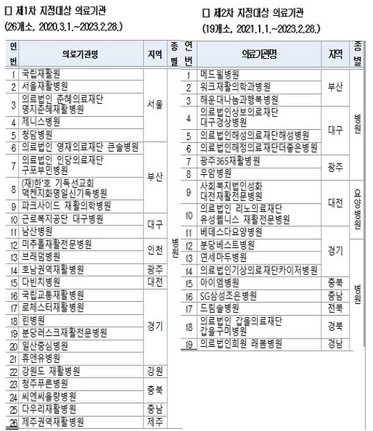 이에 따라 지난 3월 1차 평가에서 지정받은 26개소와 이번에 지정받은 19개소 등 총 45개소가 1기 회복기 재활의료기관으로 운영된다.