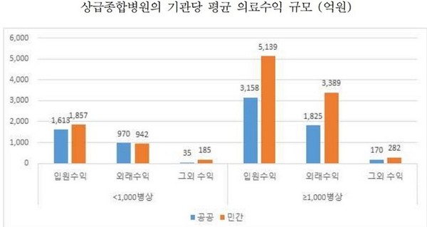 상급종합병원 1000병상 이상 그룹에서 평균 입원수익은 민간병원 5139억 원, 공공병원은 3158억 원이었다. 외래수익은 민간병원 3389억 원, 공공병원이 1825억 원으로 파악됐다.