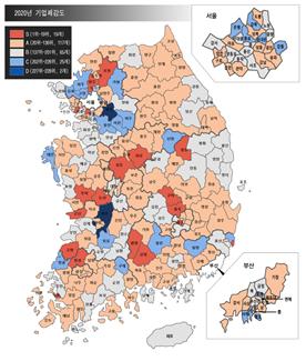 2020 기업체감도 전국 평균점수는 71.3점으로 작년(70.7점)에 비해 상승했다. 등급별로는 상위등급(S·A) 지자체가 136곳으로 전년보다 29개 증가했고, 하위등급(C·D)은 4곳 늘었다.