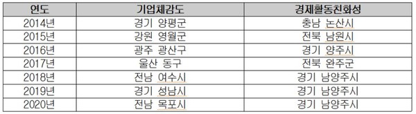대한상공회의소는 전국 228개 지자체와 지역소재 기업 6000여개를 대상으로 조사한 ‘2020년 기업환경 우수지역 평가’ 결과를 16일 발표했다.