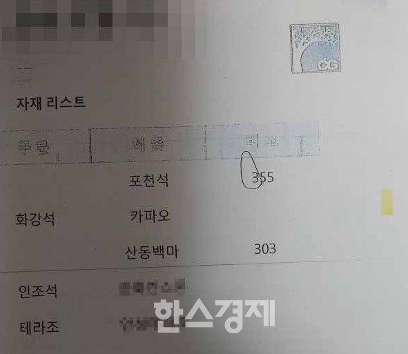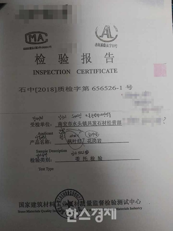 그러나 생산처를 표시하는 ‘비고’란에는 정체불명의 숫자인 ‘355’가 표기돼 있었으며, 이는 중국산 석재를 구분하는 숫자인 것으로 드러났다.