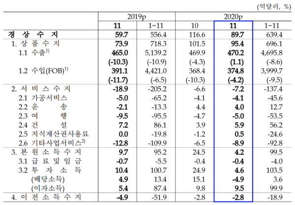 11월 상품수출은 470억2000만 달러로 469억9000만 달러를 기록한 10월 대비 3000만 달러 증가했다. 상품수입은 374억8000만 달러로 368억4000만 달러를 기록한 전월 대비 6억4000만 달러 증가했다.