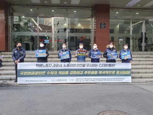 민주노총은 27일 오후 2시 CJ대한통운의 본사 앞에서 기자회견을 열고 “CJ대한통운의 주요 주주인 국민연금은 택배노동자 과로사 문제를 방치한 CJ대한통운의 공익적 이사를 선임해야한다”고 촉구했다.