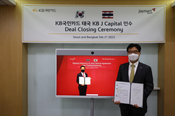 KB국민카드는 1일 서울과 태국 방콕을 온라인 화상 회의 방식으로 연결해 태국 여신전문금융회사 ‘제이 핀테크(J Fintech)’ 인수 계약을 마무리 하는 ‘딜 클로징(Deal Closing) 행사를 가졌다.