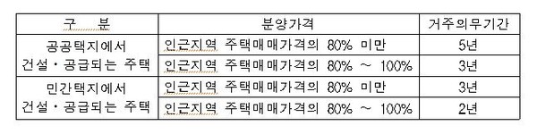 공공택지에선 인근지역 주택매매가격의 80% 미만일 경우 5년, 80% 이상 100% 미만일 경우 3년간 의무적으로 거주해야 한다.