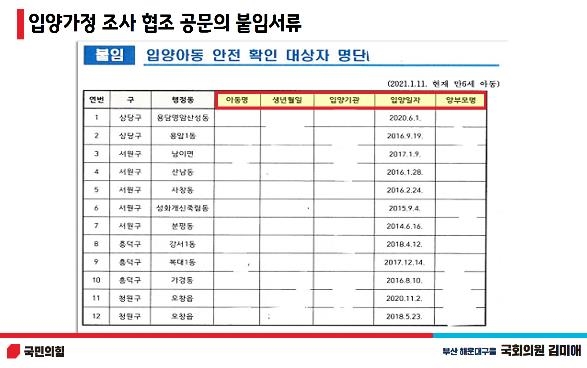 17일 국회 복지위 소속 국민의힘 김미애 의원 자료에 따르면 문 대통령의 발언 이후 서울 성동·마포구, 대전 대덕구, 전북 고창군, 충북 청주시, 경남 함안군, 경북 울진군에서 입양가정 전수조사가 이뤄졌다. 청주시의 경우 입양가정조사 협조 공문에 입양아동의 이름·생년월일·양부모이름까지 실명으로 기재했다.