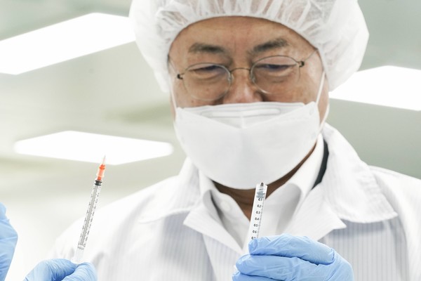문 대통령은 "일반주사기는 백신 1병으로 5명을 접종하는 데 비해 최소잔여형 주사기는 주사기의 백신 잔량을 최소화해 6명을 접종할 수 있다"며 "주사기의 효율을 고도화해 백신을 20% 아끼게 되고 결국 백신 20%를 더 생산하는 것과 같은 효과를 거두는 셈"이라고 의미를 부여했다.