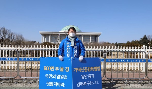 변성완 더불어민주당 부산시장 예비후보는 18일 국회앞에서 '가덕신공항 특별법 원안 통과를 촉구한다', '800만 부·울·경 시민의 염원을 짓밟지 말라'는 내용을 담은 1인 피켓시위를 벌였다.