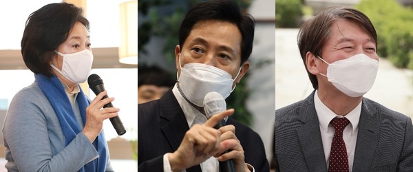 안 후보가 야권 단일후보로 나서면 47.3%로 박 후보(39.8%)에 앞섰다. 오 후보는 45.3%로 박 후보(41.6%)와 오차범위 내 박빙이었다. 반면 가상 3자 대결에서는 박 후보가 35.8%로 안 후보(26.4%)와 오 후보(24.2%)에 모두 앞섰다.