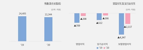 실적뿐 아니라 재무건전성 지표인 RBC 비율 역시 업계 평균을 크게 밑돌고 있다. 롯데손보의 RBC비율은 169.4%로 업계 평균(283.9%)을 크게 하회하고 있다. 손해보험사 가운데 가장 낮으며 생명보험사를 포함한 53개 보험사 가운데 DB생명(162.5%) 다음으로 낮은 수치다.