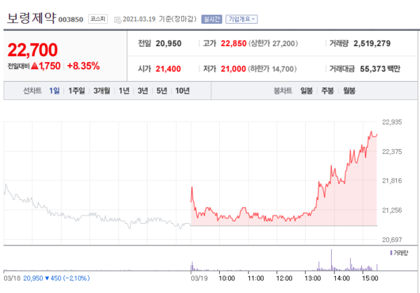보령제약은 이날 오후 급등세를 그리며 전거래일대비 8.35%(1750원) 상승한 2만2700원에 거래를 마감했다.