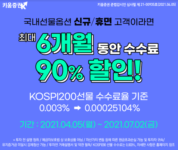 [한스경제=조성진 기자] 키움증권이 신규 및 휴면 고객 대상으로 4월 5일부터 7월 2일까지 약 3개월간 ‘국내선물옵션 수수료 최대 90% 할인 이벤트’를 진행한다고 밝혔다.