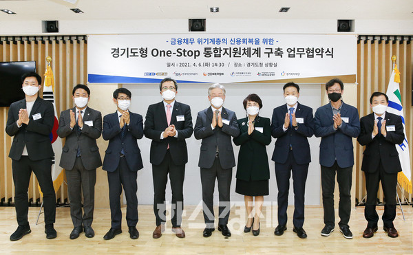 이날 이재명 지사는 경기도청 상황실에서 문성유 한국자산관리공사 사장, 이계문 신용회복위원회 위원장, 김진수 대한법률구조공단 이사장, 오숙희 IBK미소금융재단 상임이사, 진석범 경기복지재단 대표이사와 ‘금융채무위기 계층의 신용회복을 위한 경기도형 원스톱(One-stop) 통합지원체계 구축 업무협약을 체결했다.