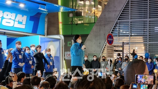 박 후보가 연단에 오르기 전 이수진 민주당 의원(비례대표)은 '써니 서포터즈'와 함께 선거송에 맞춰 율동을 했다. 일부 유권자들은 연신 '이수진'을 외치며 응원했다.