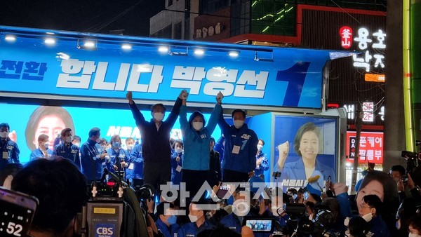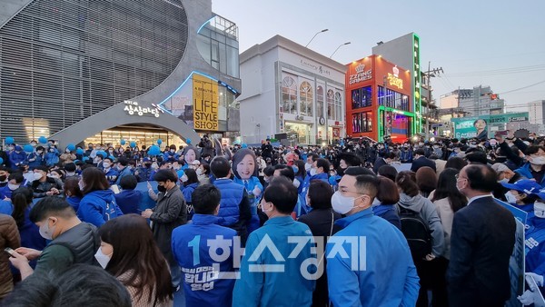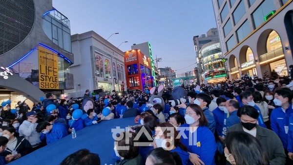 [한스경제=김동용 기자] 서울시장 보궐선거를 하루 앞둔 6일 박영선 더불어민주당 서울시장 후보의 홍대거리 집중유세 현장에 파란물결이 이어졌다.