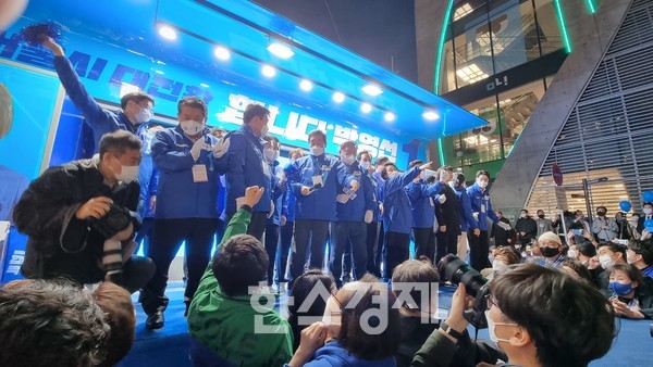 박 후보를 지원하기 위해 유세현장을 찾은 민주당 의원들과 조정훈 시대전환 의원도 연단에서 마이크를 잡았다.