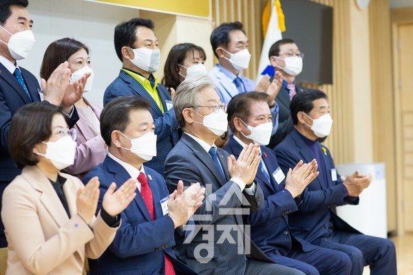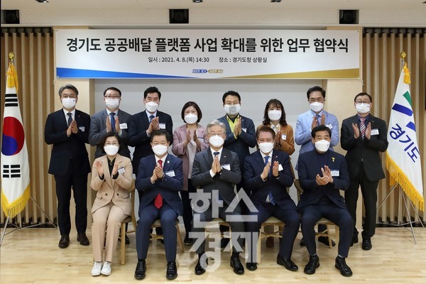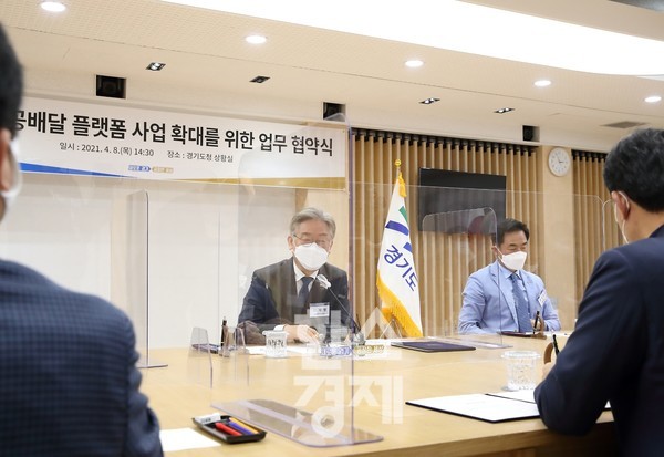이재명 지사는 8일 도청 상황실에서 윤화섭 안산시장, 최대호 안양시장, 정장선 평택시장, 박승원 광명시장, 안승남 구리시장, 김보라 안성시장, 김상돈 의왕시장, 이춘표 고양제2부시장, 조학수 양주부시장, 이석훈 경기도주식회사 대표와 ‘경기도 공공배달 플랫폼 사업 확대를 위한 업무협약’을 체결했다.