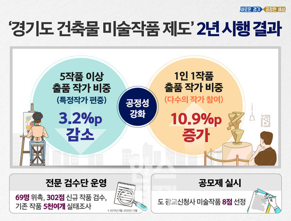 [한스경제=(수원)김두일 기자] 경기도는 건축물 미술작품 제도의 공정성 강화를 위해 ‘경기도 건축물 미술작품 제도’를 2년 동안 시행한 결과, 건축물 미술작품 시장에서 작품 하나를 출품하는 작가 비중이 과거 2년 대비 11%p 증가하는 등 작품 다양화에 성과를 거둔 것으로 나타났다고 24일 밝혔다.
