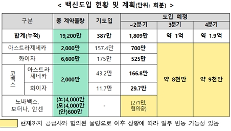 이 중 6월 말까지 국내에 들어오기로 확정된 물량은 904만4000명분(1808만8000회분)으로, 정부는 7월부터 노바백스·모더나·얀센 백신 도입도 본격화해 9월 말까지 총 1억회분을 공급할 계획이다. 노바백스 백신 등도 일부는 상반기에 도입할 방침이다.