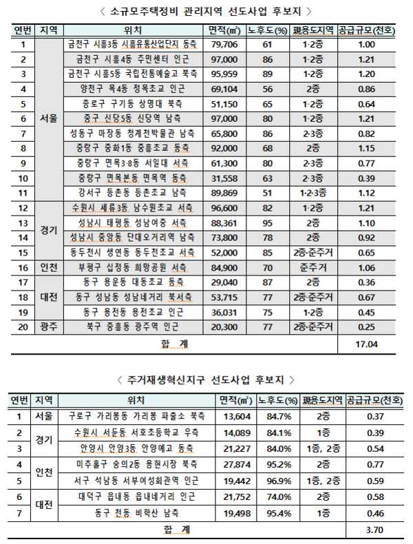 소규모 주택정비 관리지역 선도사업 후보지로는 서울 금천·양천·종로·중구·성동·중랑·강서, 경기 성남·수원·동두천, 인천 부평, 대전 동구, 광주 북구 등 총 20곳이 선정됐다. 이들 지역에선 약 1만7000호가 공급될 예정이다.