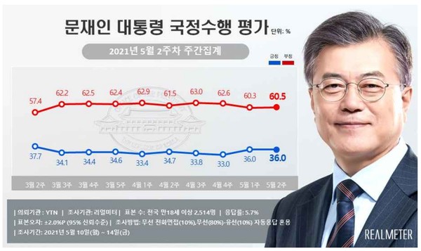 여론조사 전문기관 리얼미터가 YTN 의뢰로 10일부터 14일까지 조사한 5월 2주차 주간집계에서 문 대통령 취임 201주차 국정수행 지지율(긍정평가)은 전주와 같은 36.0%(매우 잘함 18.3%·잘하는 편 17.7%)로 나타났다.
