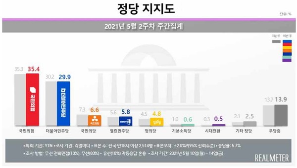 이밖에 국민의당은 0.7%포인트 오른 6.6%, 열린민주당은 0.2%포인트 오른 5.8%, 정의당은 0.3%포인트 오른 4.8%, 기본소득당은 0.4%포인트 내린 0.6%, 시대전환은 0.2%포인트 오른 0.5%, 기타정당은 0.4%포인트 오른 2.5%로 나타났다. 무당층은 0.2%포인트 오른 13.9%였다.