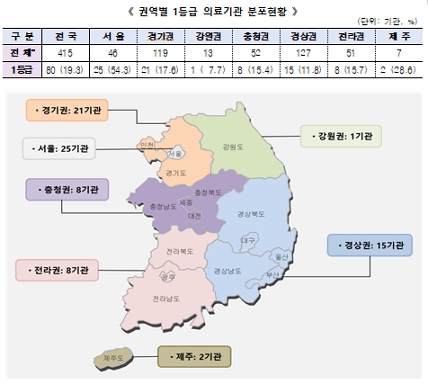 평가 결과, 종합점수 평균은 61.7점이며 1등급 기관은 80기관(종합점수 산출기관 대비 19.3%)으로, 서울 25기관, 경기권 21기관, 경상권 15기관 등 전국 권역별로 분포하고 있다.