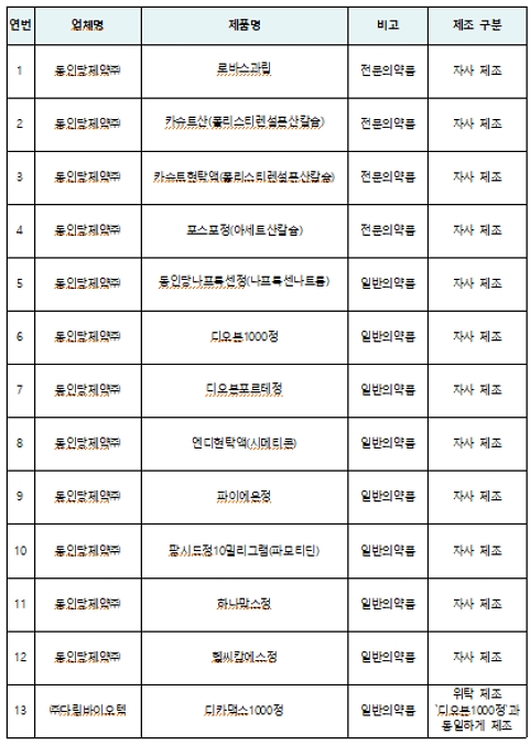 한편 해당 제품은 동인당제약의 자사 제조 제품으로 전문의약품인 △로바스과립 △카슈트산(폴리스티렌설폰산칼슘) △카슈트현탁액(폴리스티렌설폰산칼슘) △포스포정(아세트산칼슘) 등과 일반의약품인 △동인당나프록센정(나프록센나트륨) △디오본1000정 △디오본포르테정 △엔디현탁액(시메티콘) △파이에온정 △팜시드정10밀리그램(파모티딘) △하나막스정 △헬씨캄에스정 등과 다림바이오텍의 제품인 △디카맥스1000정 등이다.