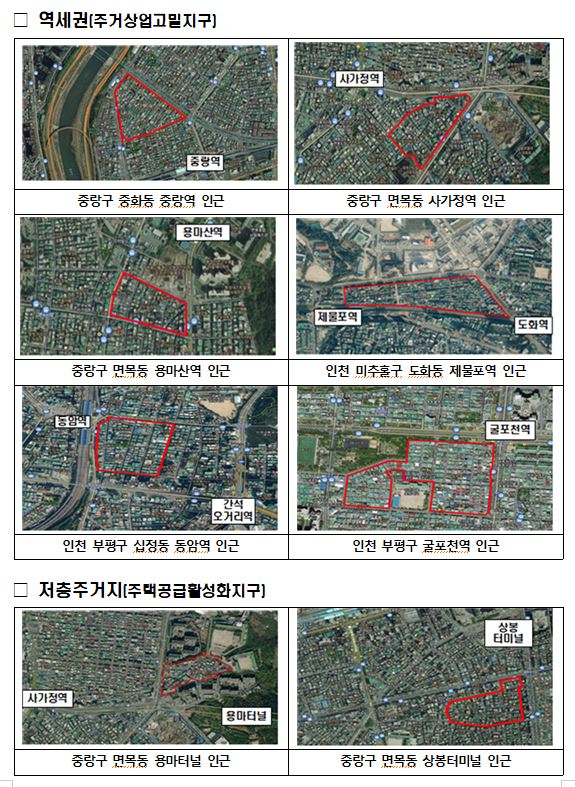 서울 중랑구 5곳(▲중랑구 중화동 중랑역 인근 ▲면목동 사가정역 ▲면목동 용마산역 인근 ▲면목동 용마터널 인근 ▲면목동 상봉터미널 인근), 인천 미추홀구 1곳(도화동 제물포역 인근) 및 부평구 2곳(십정동 동암역 인근, 굴포천역 인근) 등 총 8곳(역세권 6, 저층주거지 2)으로 이들 구역에서 사업이 추진될 경우 약 1만1600호 주택이 공급될 것으로 예상된다.