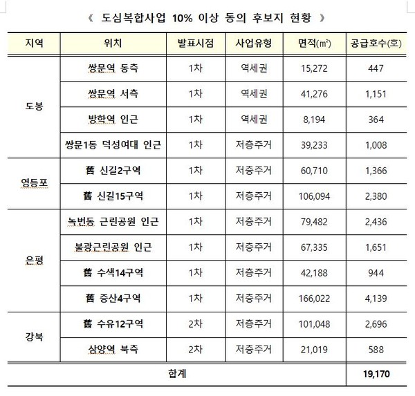 1~3차 발표 후보지 38곳 중 ▲서울 도봉구 쌍문역 ▲방학역 인근 ▲영등포구 신길15구역 ▲강북구 수유12구역 등 12곳은 이미 예정지구 지정요건인 10% 동의를 확보했다. 이 중 ▲은평구 증산4 ▲수색14구역 등 2곳은 본지구 지정 요건인 3분의 2 이상 동의를 확보했다.