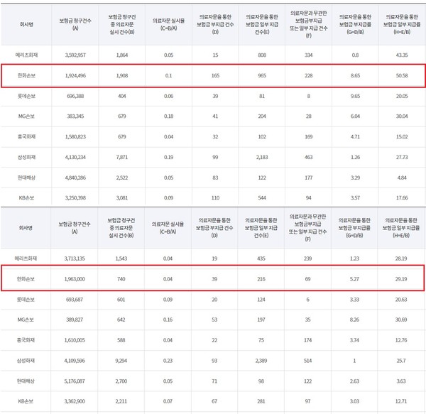 손해보험협회 의료자문 현황 공시에 따르면 한화손해보험의 지난해 의료자문을 통한 보험금 부지급 건수 및 부지급률은 각각 204건, 7.7%로 16개 보험사 가운데 가장 높은 수치를 기록했다. 업계 평균치(70건·2.7%)를 크게 웃도는 수치다.