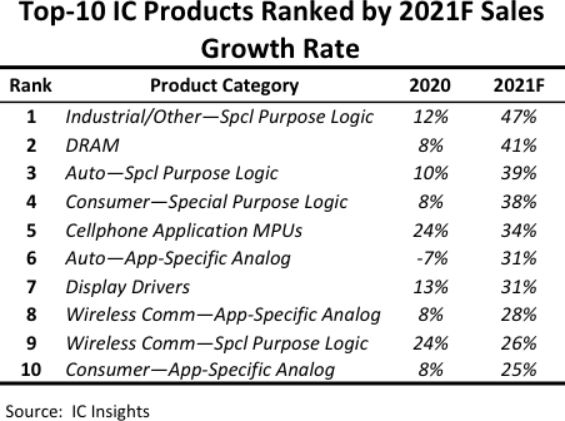 IC인사이츠는 “D램과 낸드플래시 등 메모리 반도체의 비트단위 가격 강세가 지속되고 로직 반도체와 아날로그 반도체 제품군 전망이 예상보다 나아져 전체 반도체 성장률을 상향 조정했다”고 설명했다.