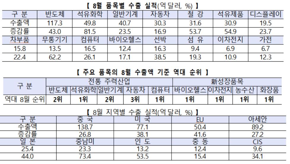 수출 품목별로는 3개월 연속 15대 주요 품목이 모두 증가한 것에 더해 사상 최초로 15대 품목이 두 자리 수로 증가했다. 반도체·석유화학·일반기계 등 주력산업이 꾸준히 선전하고 있고 헬스·이차전지·농수산식품·화장품 등의 신산업이 역대 8월 수출액 1위를 기록하며 전통산업과 유망산업이 고른 성장세를 보였다.