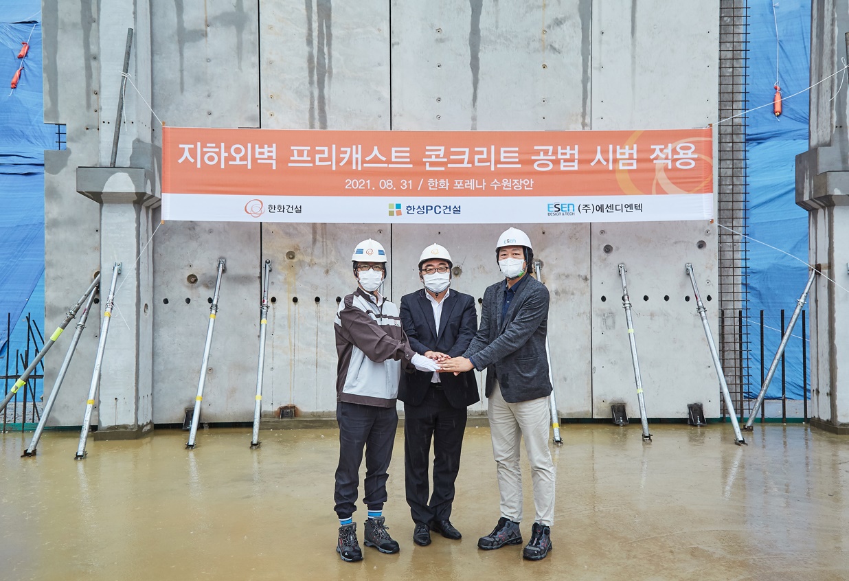 지하외벽 PC공법은 한화 포레나 수원장안 아파트 106동 인근 지하주차장 2개 경간(16m), 총 9개 부재를 목업(시험) 시공했다. 윤용상 한화건설 건축사업본부장, 이진섭 한성PC건설 영업시공본부장, 류종우 에센디엔텍 대표 등 관계자들이 직접 참관했다.