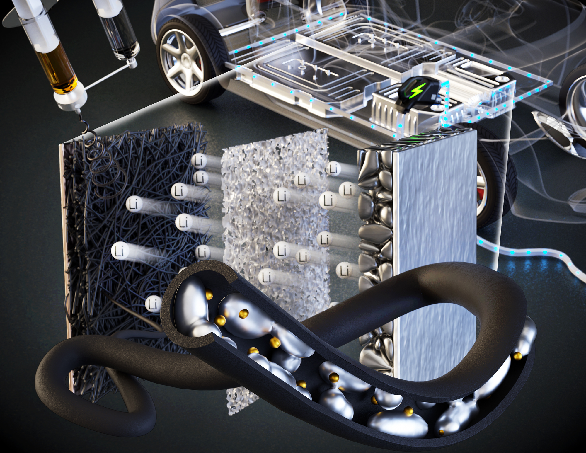 이런 문제를 해결하기 위해 KERI 김병곤 박사는 리튬 친화성 물질인 ‘금’ 나노 입자가 내부에 소량(무게 비 1%) 포함된 ‘코어-쉘(Core-Shell)’ 구조의 ‘탄소 나노 파이버’를 제작했고, 코어 내부에 리튬을 선택적으로 저장함으로써 리튬 전·탈착(electro-deposition·dissolution) 효율을 향상시키는 방식을 활용했다.