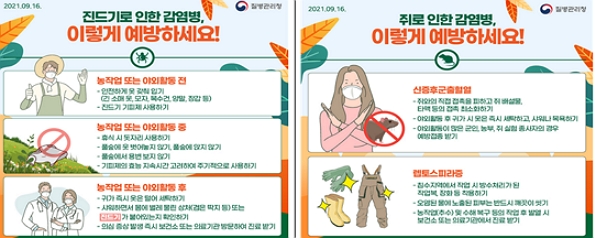 [한스경제=홍성익 보건복지선임기자] 질병관리청(질병청)이 가을철에 환자 발생이 급증하는 진드기·설치류(쥐)에 의한 감염병을 예방하기 위해 농작업 및 야외활동 시 감염병 예방수칙을 준수해줄 것을 당부하고 나섰다.