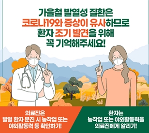 정은경 질병관리청장은 “코로나19와 가을철 발열성 질환의 증상이 유사하므로 유증상자는 아프면 빨리 병원을 방문해 야외활동력 등을 알리고 적기에 치료받고, 의료인은 적극적인 감별진단을 통해 가을철 발열성 감염병 진단 및 치료가 지연되지 않도록 주의를 당부한다”고 강조했다.