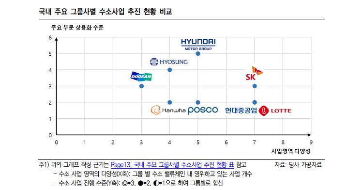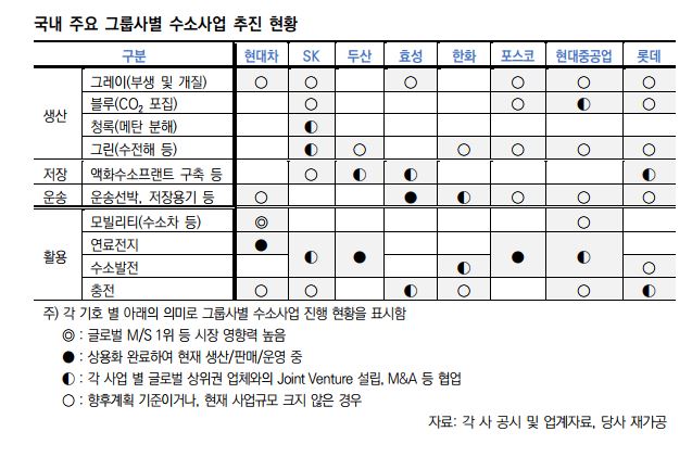 특히 현대자동차그룹, SK그룹은 그룹 내 활용 가능한 자원을 바탕으로 상대적으로 빠른 속도로 수소 경제 전환에 대응하고 있다는 평가를 받고 있다.