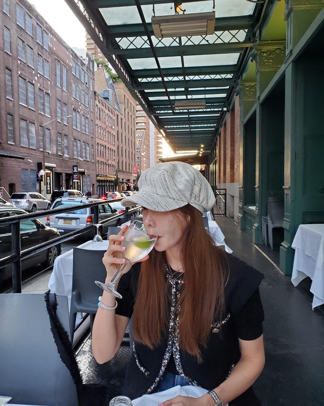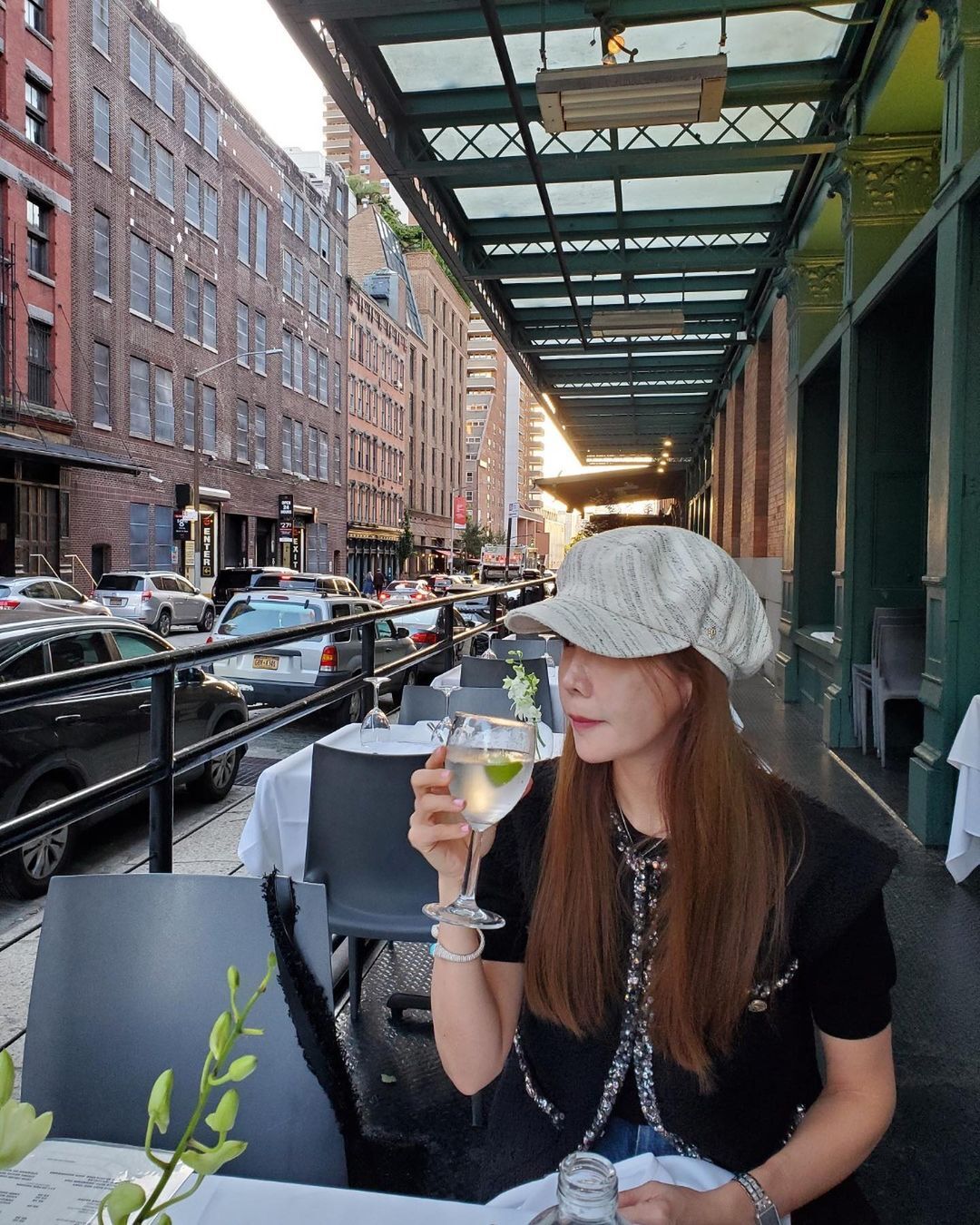 사진 속 김정은은 뉴욕의 한 식당 테라스에 앉아 우아한 모습으로 바깥을 바라보고 있는 모습이다.