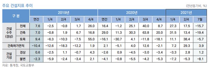 다만 건설수주 등 선행지표 누적 물량이 상당함을 감안했을 때 4분기부터 내년까지 건설기성을 중심으로 동행지표 회복세가 예상된다는 게 건정연 전망이다.