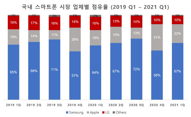 지난 2분기 국내 스마트폰 시장 점유율은 삼성전자 71%, 애플 17%, LG전자 11%, 기타 1% 순이다. 지난해 점유율은 삼성전자가 63.4%, 애플이 23.5%로 집계됐다. 애플은 미국·일본 시장 등에선 점유율의 절반가량을 차지하고 있으나, 국내 스마트폰 시장에서는 영 힘을 못쓰고 있다. 애플은 국내 시장에서 20%대 수준을 유지하다가 지난해 4분기 아이폰12 제품으로 처음 31%의 점유율을 기록했다. 만약 애플이 LG전자의 10%를 그대로 흡수할 경우 올해 4분기에는 삼성전자와의 격차가 10%포인트까지 좁혀질 수 있다는 업계의 관측도 나온다. 여기에 LG전자와의 동맹까지 호재로 작용해 단박에 삼성전자를 위협할 수도 있는 상황이다.