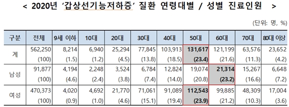 지난해 기준 ‘갑상선기능저하증’ 질환의 연령대별 진료인원 구성비를 살펴보면 전체 진료인원(56만2000명) 중 50대가 23.4%(13만2000명)로 가장 많았고, 60대 21.6%(12만1000명), 40대 18.5%(10만4000명)의 순이었다.