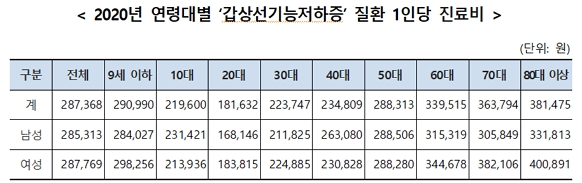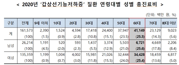 지난해 기준 성별 ‘갑상선기능저하증’ 건강보험 총진료비 구성비를 연령대별로 살펴보면, 60대가 25.5%(411억 원)으로 가장 많았고, 50대 23.5%(379억 원), 40대 15.1%(244억 원)순이었다. 성별로 구분해보면 남성은 60대가 25.6%(67억 원)로 가장 많았고, 여성은 60대가 25.4%(344억 원)로 가장 많았다.