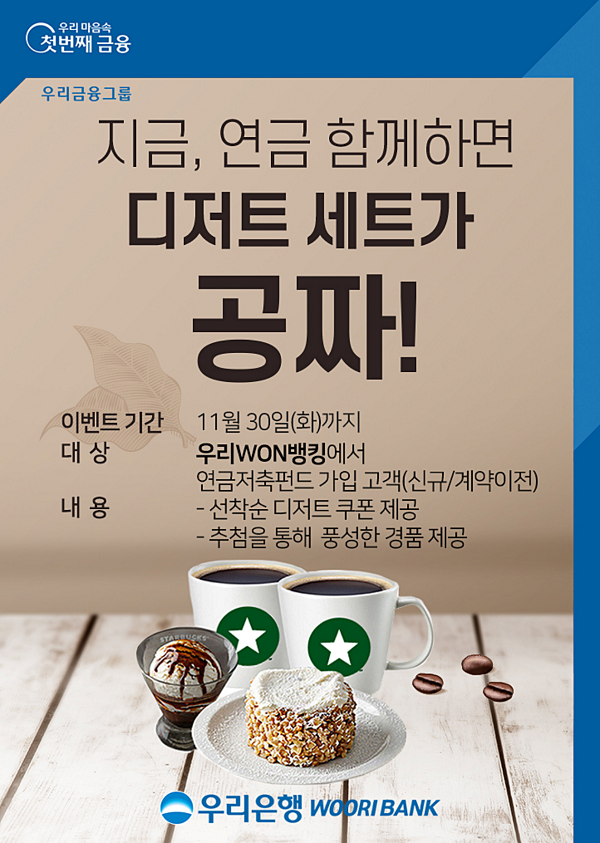 우리은행은 연말정산을 미리 준비하는 고객을 위해‘지금, 연금 함께하면 디저트 세트가 공짜’ 이벤트를 11월 30일까지 실시한다고 8일 밝혔다.