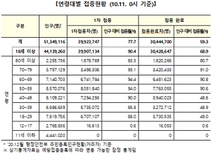 앞서 추진단의 11일 0시 기준 발표에서는 1차 접종의 경우, 신규 2723명이 추가돼 3992만3747만명으로, 인구 대비 77.7%, 18세 이상 대비 90.4%였다.