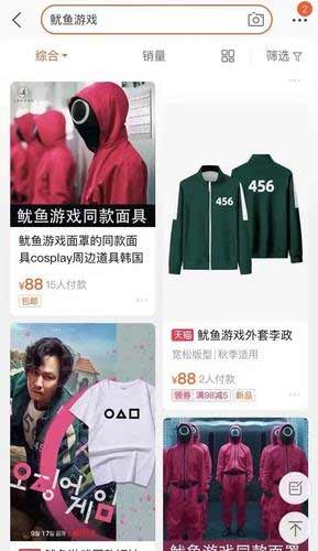 또한 "한국의 온라인 쇼핑사이트 쿠팡에서 오징어 게임 관련 최고 인기 상품 일부는 중국 광둥성 광저우와 선전, 안후이성의 기업들이 판매하는 것"이라며 "상품 문의란은 핼러윈까지 배송이 가능하냐는 문의로 가득 차 있다"고 전했다. 중국 쇼핑사이트 ‘알리바바닷컴’이나 알리바바 산하 최대 쇼핑앱 ‘타오바오’에서도 유사한 상황이 벌어지고 있다.